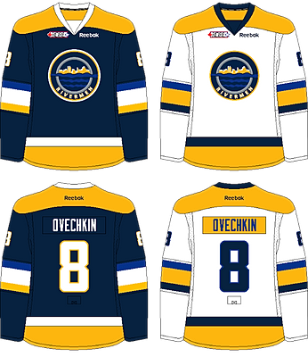 Caden shows us how his team's uniforms will look for the upcoming season, as of now they look like this. The new set will have a very original number font and be without any white in the striping. Like all of the released jerseys, except for the Pilots and the Bighorns, the Rivermen will have the Nike fake laces. The striping pattern's unique in the HCIHL although you lose the lighter blue on the dark jersey. YOU ALWAYS NEED TV NUMBERS!!!! Ok Caden already told us why it was tough for him to apply them, but you still should have them kids. The helmet is very pixelated, I'm not sure if you can fix that in pain though. Concept Rating 7.4/10
